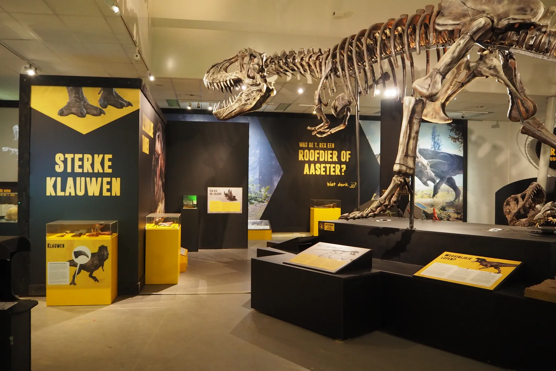 Centraal in de tentoonstelling staat een levensgroot T. rex-skelet. Van zijn enorme schedel tot zijn lange staart, hier zie je pas hoe gigantisch deze dinosaurus echt was.